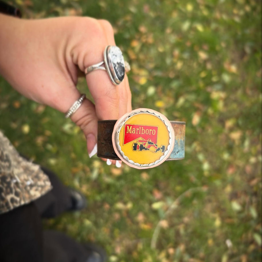 Crafted from a 60's chevy pickup bedside and perfectly preserved patina, with a nostalgic Marlboro enamel to add the finishing touches.